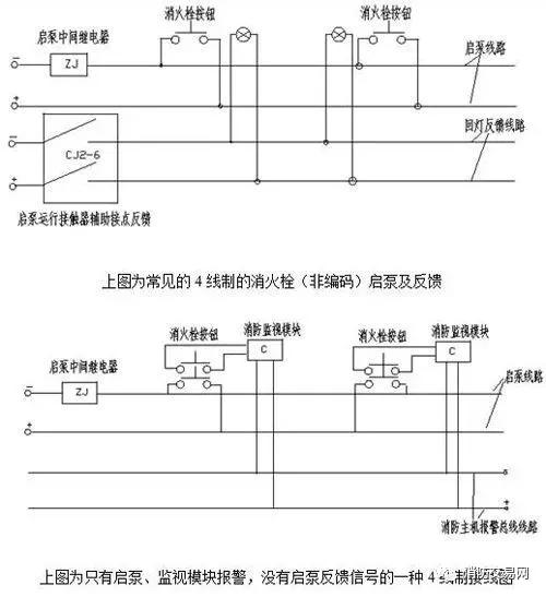 (3)4线制按钮启泵,常见的有3种方式即:启泵回灯各2根线,启泵时所用的消火栓按钮回灯都会点亮。另外一种就是启同时主机通过其监泵的视模块反馈报警,没有回灯信号(不符合现在法规要求),还有一种是消防系统带地址码的消火栓按钮,启泵、总线制,启泵同时主机报警,水泵运行反馈信号到主机,主机通过程序命令编码消火栓回答灯点亮。