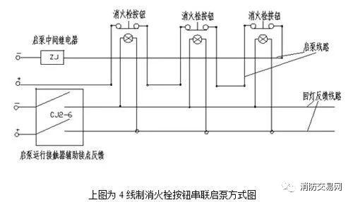 2.消火栓按钮串联启泵方式,就是所有的消火栓按钮都是串联,常见的有4线制和6线制。这种启泵的特点:控制继电器失电,通过常闭接点接通控制回路,启动水泵。优点:可以有效的监视线路和设备,优于并联系统。缺点:水泵控制柜必须放置于自动挡,整个系统的线路损坏(短路),不进行测试时无法发现其系统的好坏,这种启泵总线路发生短路故障水泵正常无法启动;或继电器损害就会启动水泵。