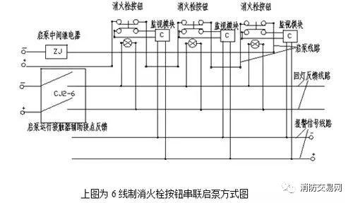 (2)6线制按钮串联启泵常见的方式:启泵、回灯、报警各2根线,启泵时所用的消火栓按钮回灯都会点亮,有报警信号。